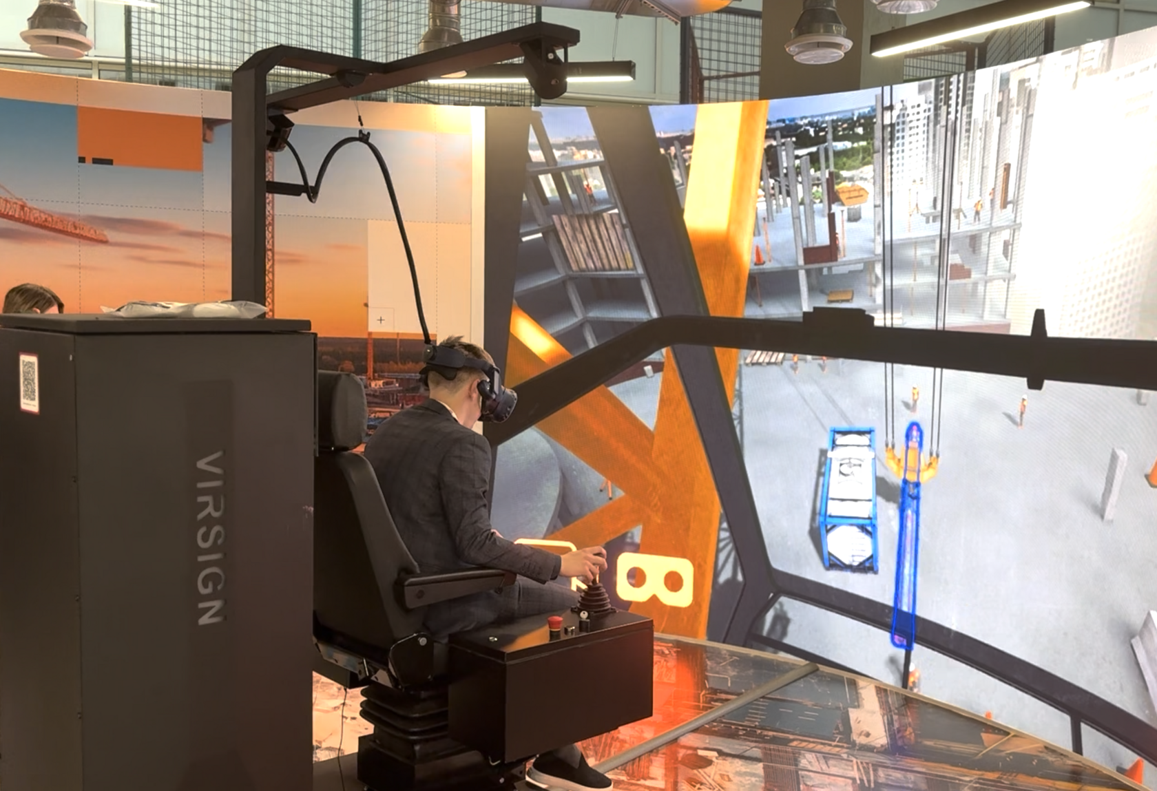 - Надев VR-очки — пользователь «погружается» в виртуальную строительную площадку с реалистичным видом из кабины; видимость, расстояния, положение груза — всё соответствует реальным условиям.