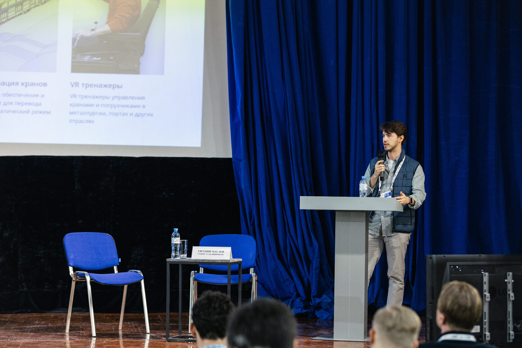 Савва Воробьев, технический директор ООО «Вирсайн Инновации», выступил с докладом «Беспилотный кран. Алгоритм перевода мостового крана в беспилотный режим работы» в рамках сессии промышленная роботизация, безлюдные и малолюдные производства.